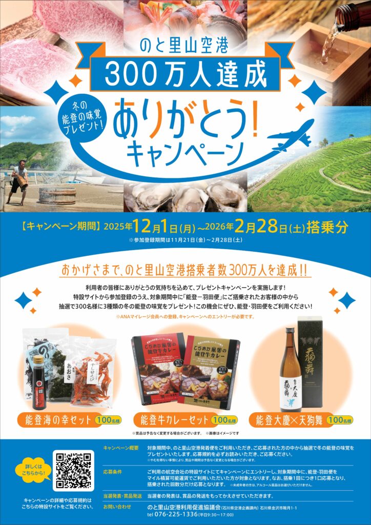対象期間中、のと里山空港発着便をご利用いただき、ご応募された方の中から抽選で石川県の特産品をプレゼントいたします。応募規約を必ずお読みいただき、ご応募ください。