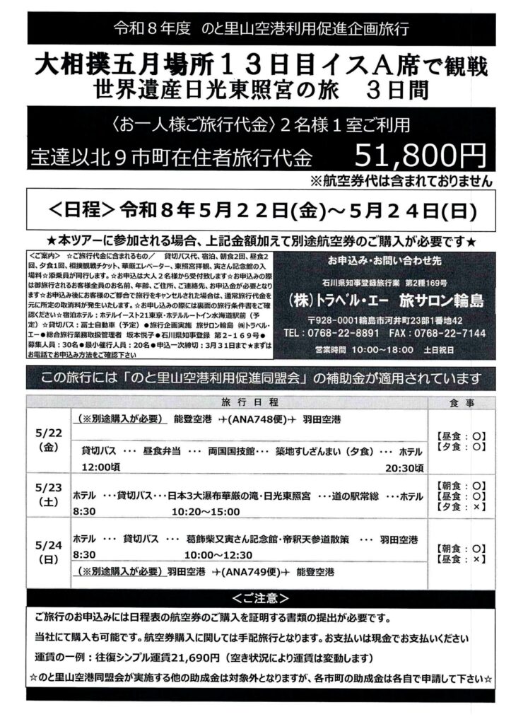 のと里山空港利用促進企画旅行「大相撲五月場所の観戦と世界遺産日光東照宮を巡る旅」におきましては、ご好評につき、定員に達したため募集を締め切らせていただきます。
